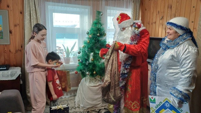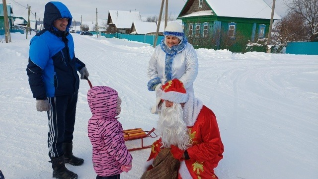 Дед Мороз обошёл всю деревню и зашёл в каждый дом, где его ждали ребята. Он поздравил детей с праздником, пожелал здоровья, хорошего поведения и отличных оценок в школе. Снегурочка с улыбкой раздавала подарки и мандарины.