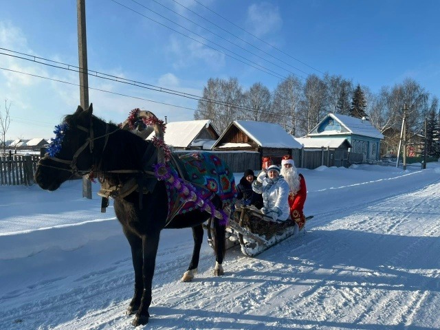 В деревню Тайкаш приехали Дед Мороз и Снегурочка. Они прибыли на лошади, чтобы поздравить детей с Новым годом.