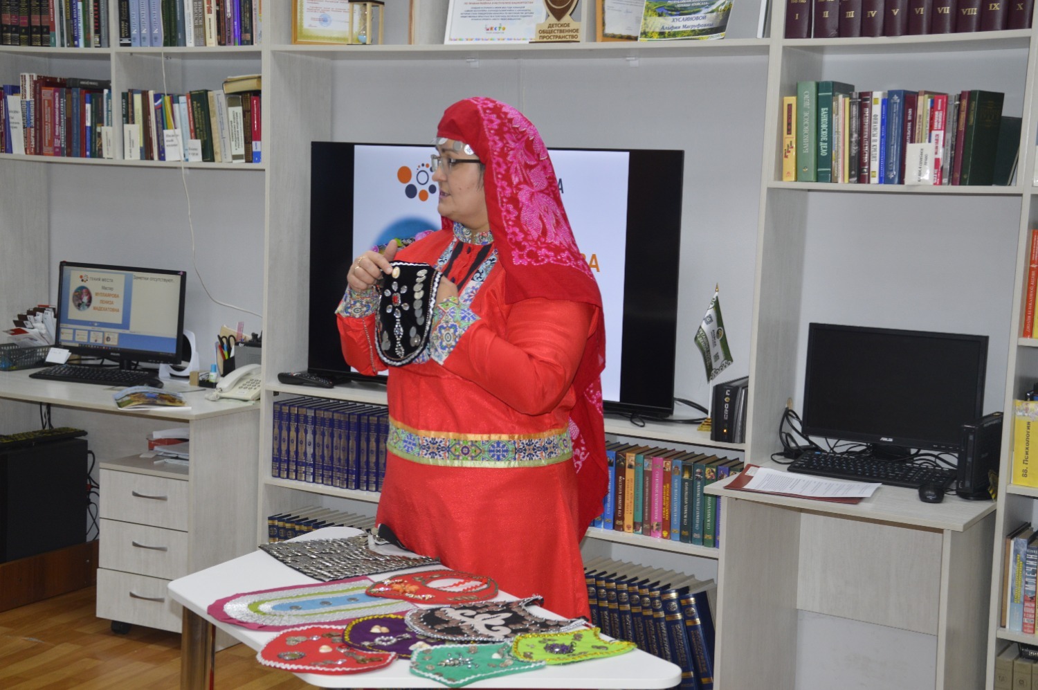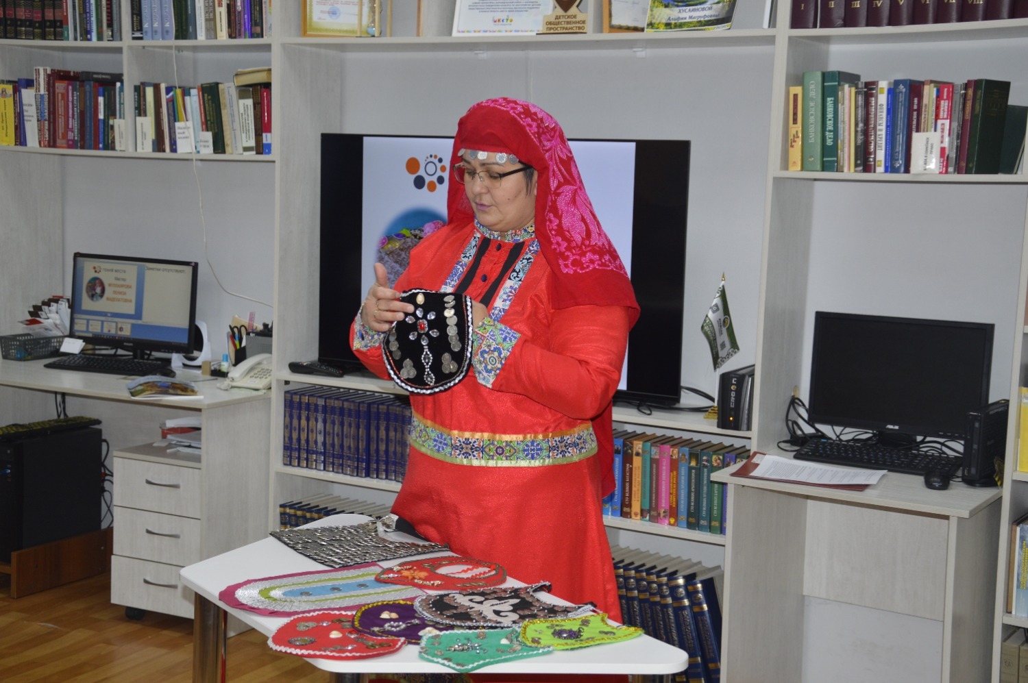 Сегодня она провела мастер-класс по изготовлению башкирского нагрудника «Традиции своими руками». В начале мастер рассказала о традициях создания башкирских нагрудников и их особенностях, после чего гости мероприятия приступили к изготовлению нагрудников. Процесс оказался увлекательным и кропотливым: все элементы пришивались вручную, а для шитья использовались плотные ткани из фетра, бисер, монеты и декоративные ленты.