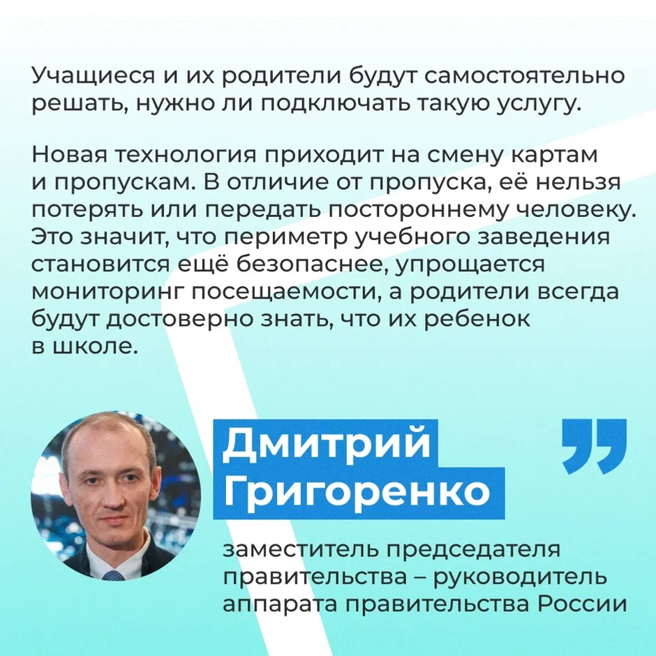 Заместитель председателя правительства – руководитель аппарата правительства России Дмитрий Григоренко отметил, что применение биометрии для прохода в учебные сервисы – строго добровольное дело.