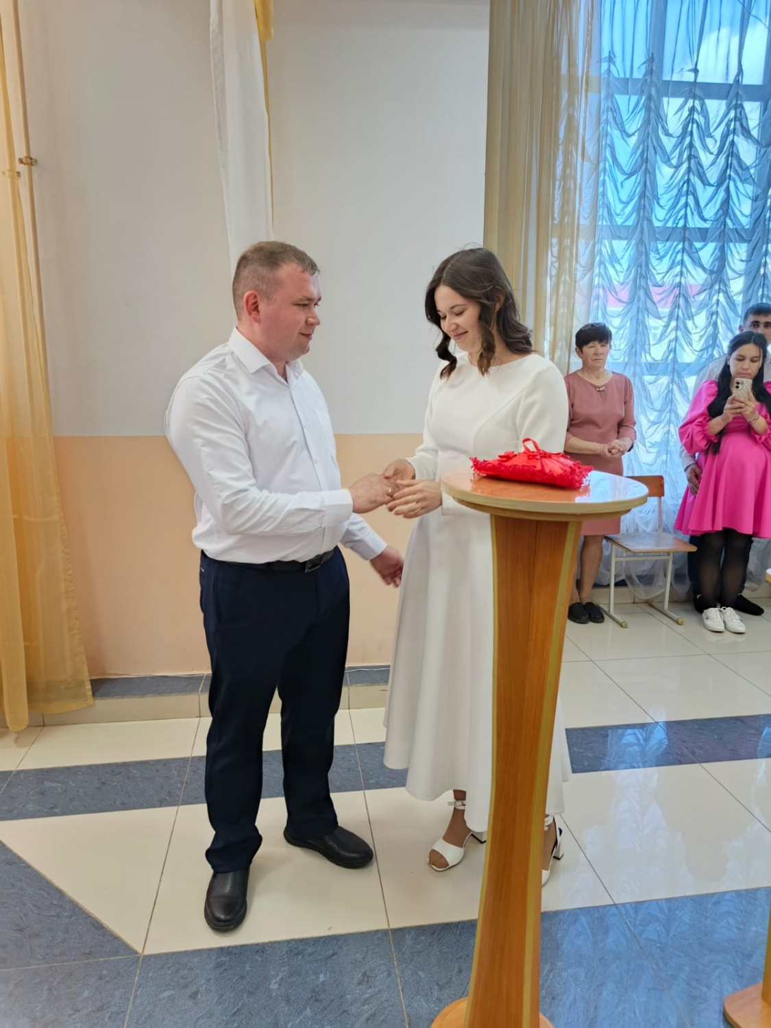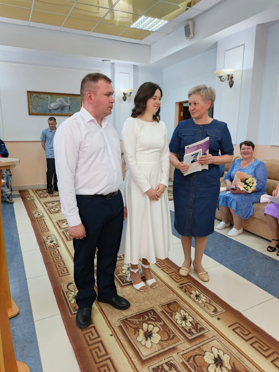 Вела официальную церемонию начальник отдела ЗАГС по Караидельскому району Линара Шарифьянова. Как и заведено, она удостоверилась в том, что молодожены согласны вступить в законный брак, предложила им расписаться в акте о регистрации, а затем вручила новоиспеченным супругам их первый семейный документ - свидетельство о браке, а также поздравительный адрес Главы РБ. Затем Галины обменялись кольцами и скрепили свой союз поцелуем.