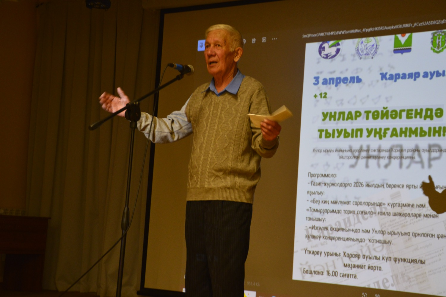 3 апрель көндө Ҡараяр ауылында Унлар ырыуы съезына әҙерләнеү сиктәрендә «Унлар төйәгендә тыуып уңғанмын» тип аталған фәнни-эҙләнеү конференцияһы һәм район гәзитенә яҙылыу акцияһы үҙ эшен дауам итте.